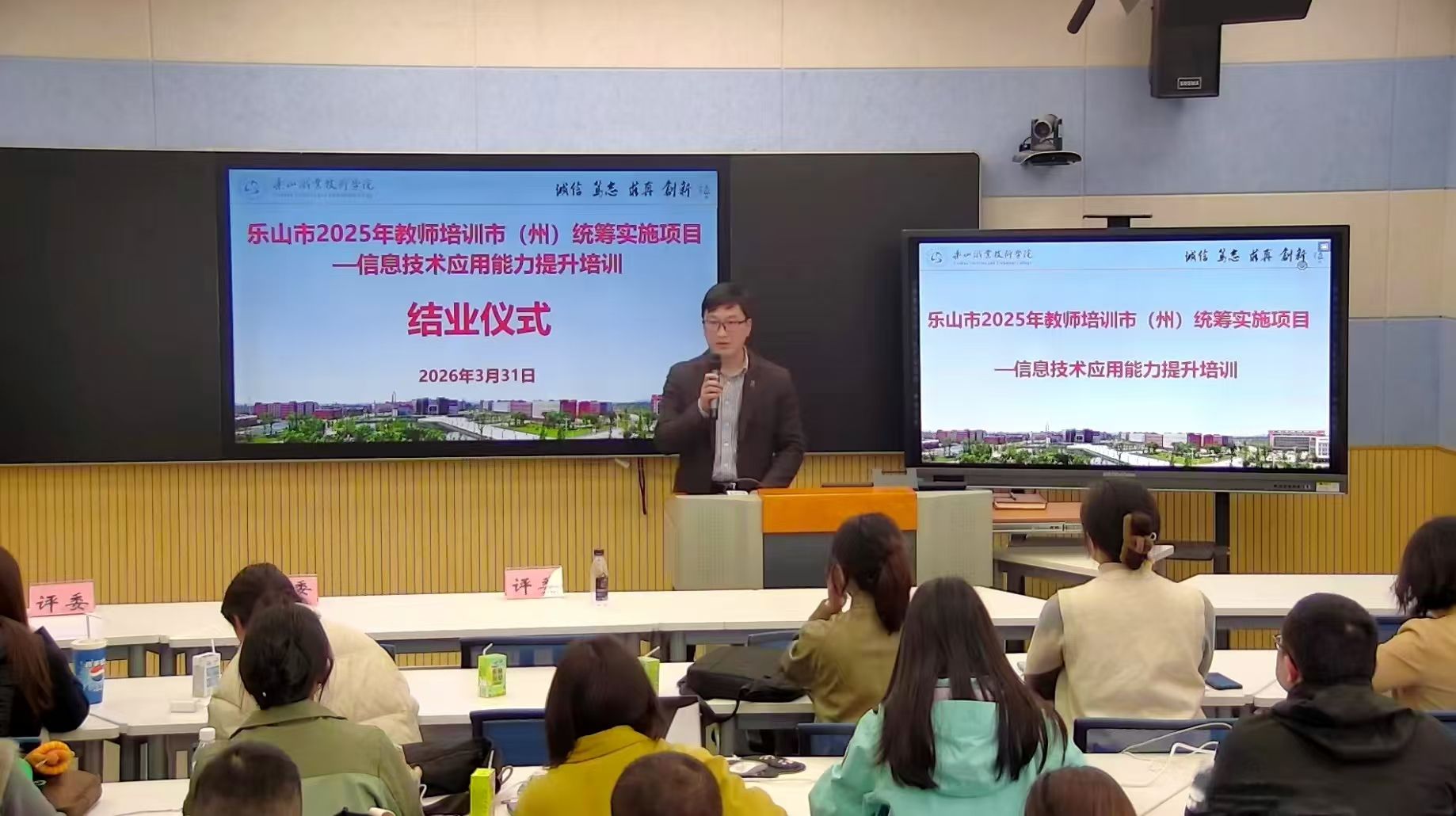 3月31日下午,由乐山市教育局主办、乐山职业技术学院承办的“乐山市2025年教师培训市(州)统筹实施项目——信息技术应用能力提升培训班”圆满落下帷幕。来自全市17所中职学校的63位中职教师顺利完成各项培训任务,如期结业。结业式由人事处副处长周书来主持。