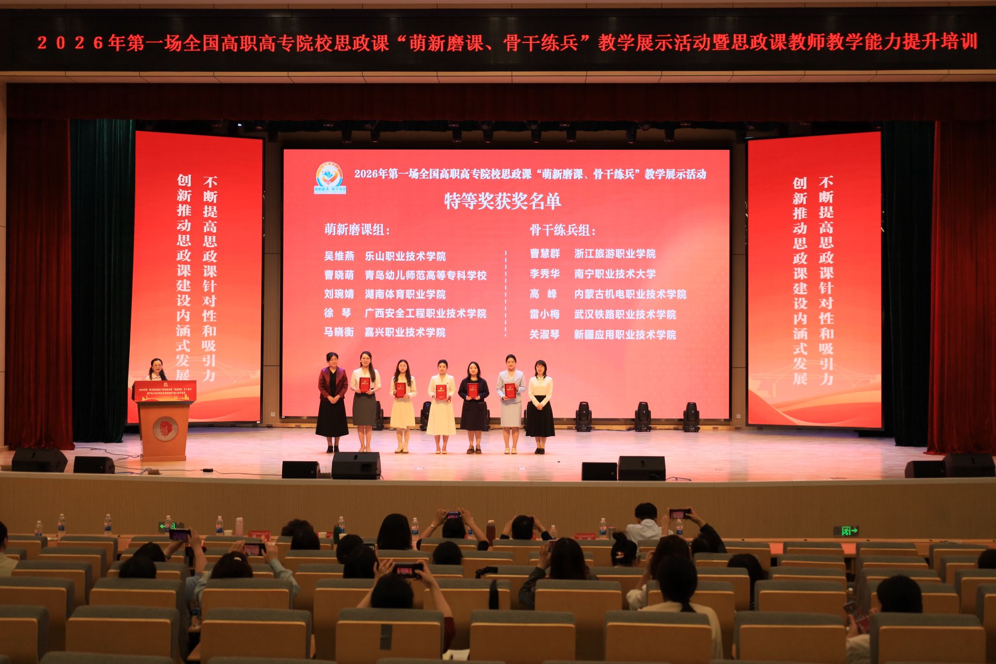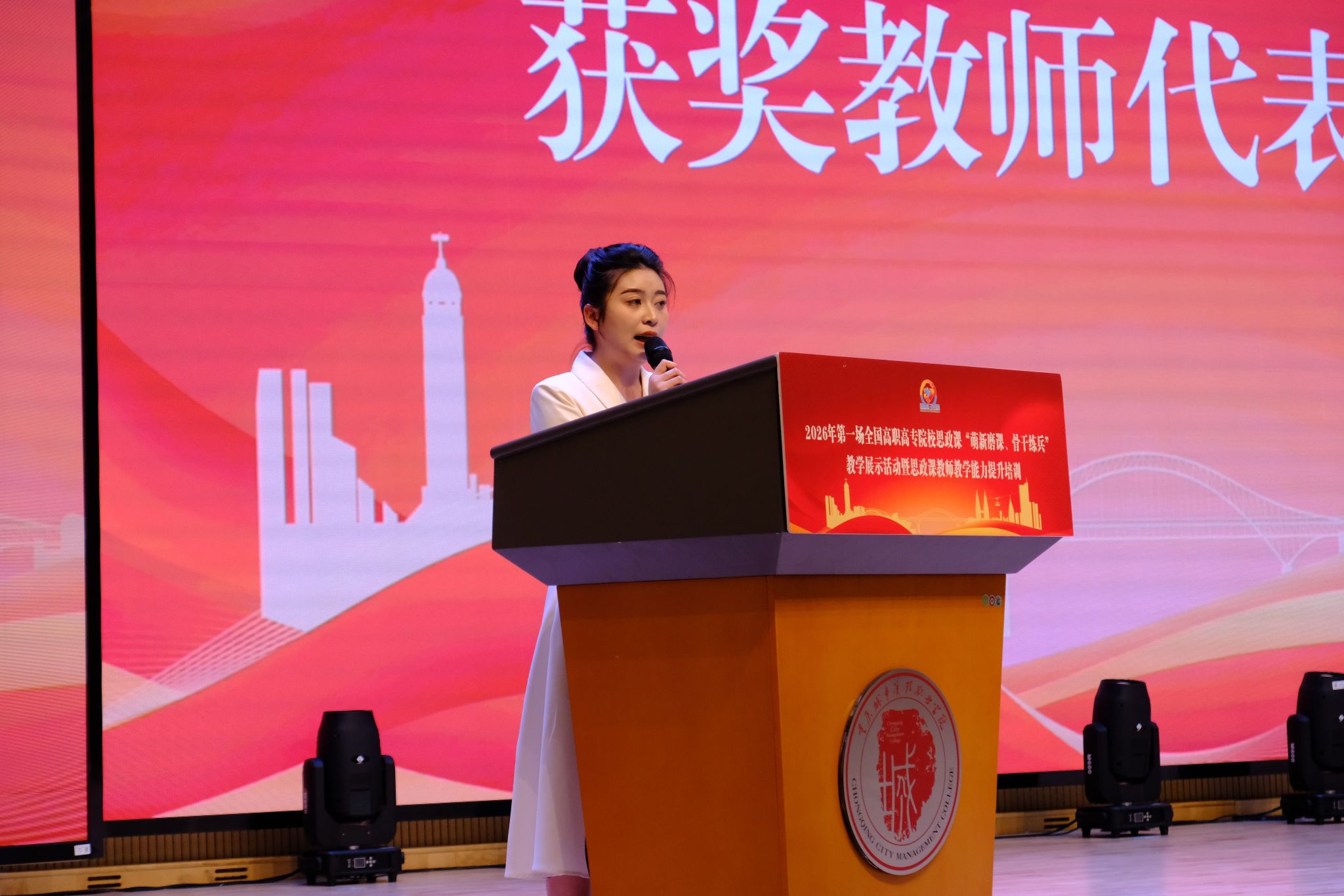 为提升全国高职高专院校思想政治理论课教师的政治素养和业务能力,不断增强思政课的思想性、针对性、理论性和亲和力,4月11日,全国高职高专院校思政课建设联盟在重庆城市管理职业学院举行了2026年第一场“萌新磨课 骨干练兵”教学展示活动。乐山职业技术学院马克思主义学院青年教师吴维燕在比赛中表现卓越,以总分第一名荣获“萌新磨课”组特等奖,并以获奖教师代表身份在闭幕式上发言,展现了我校思政课教师扎实的教学功底与风采。