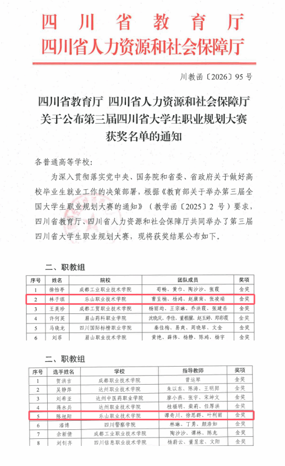 近日,四川省教育厅、四川省人力资源和社会保障厅联合发布《关于公布第三届四川省大学生职业规划大赛获奖名单的通知》,喜讯传来!我校师生在本次省级重磅赛事中表现优异,林子琪老师团队斩获职教组教师赛道金奖,陈旭阳同学荣获职教组成长赛道金奖,一举拿下双项最高荣誉,实现我校在该项赛事上的历史性重大突破,充分彰显我校职业规划教育的深厚底蕴与扎实成效!