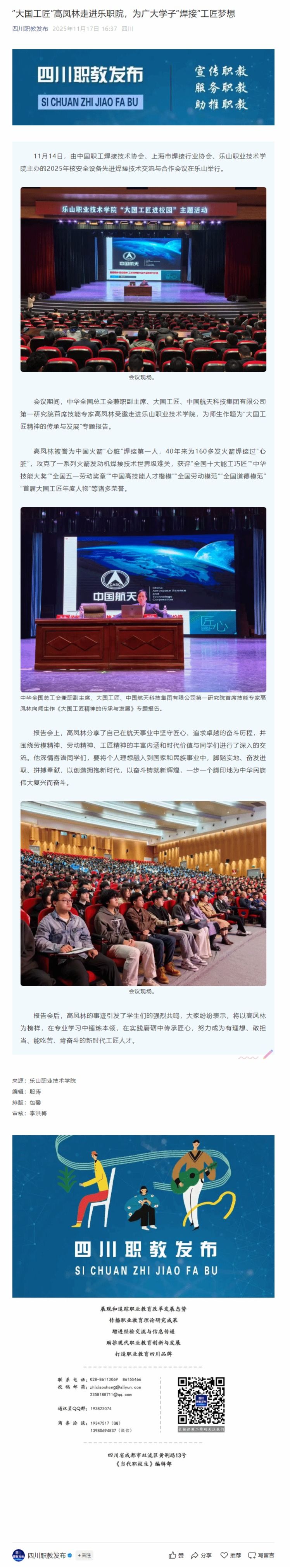四川教育发布:“大国工匠”高凤林走进乐山职业技术学院,为广大学子“焊接”工匠梦想
