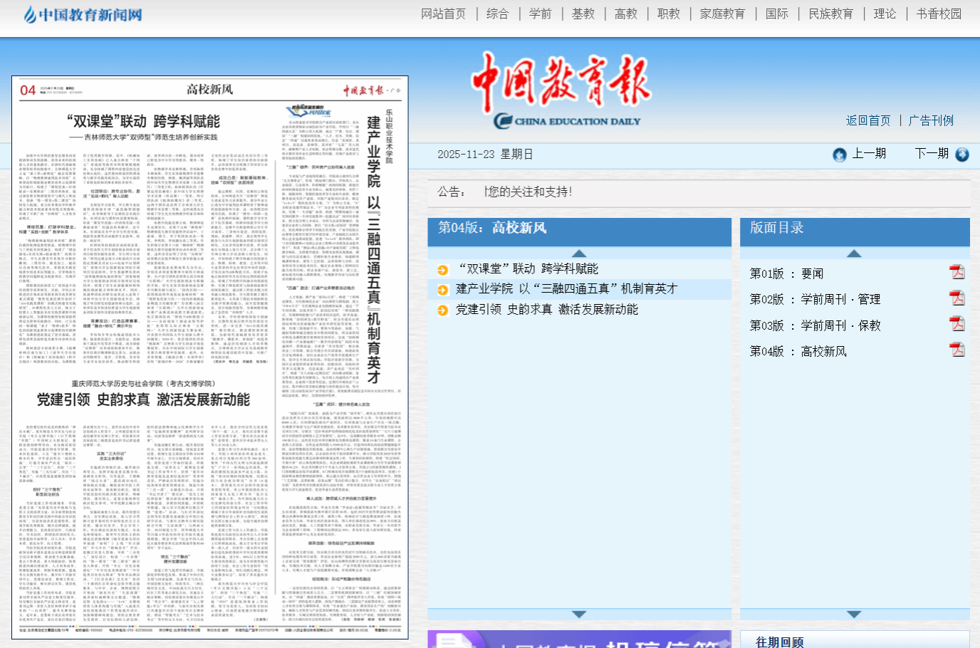 聚焦产业需求、深化产教融合,是职业院校彰显办学特色、提升服务能力的关键之举。乐山职业技术学院始终坚守职业教育初心使命,紧扣乐山晶硅光伏、智能制造等重点产业发展方向,以“4517”专业发展思路为引领,重点打造高水平特色专业群,与省内外170余家知名企事业单位建立深度合作关系,通过共建产业学院、共享实训资源、共推技术攻关、共育技能人才,实现了人才培养与产业需求精准对接、教育发展与区域振兴同频共振,积累了丰富的产教融合实践经验。11月23日,《中国教育报》以“建产业学院 以‘三融四通五真’机制育英才”为题,对我校产教融合工作特色和亮点进行了详细报道。