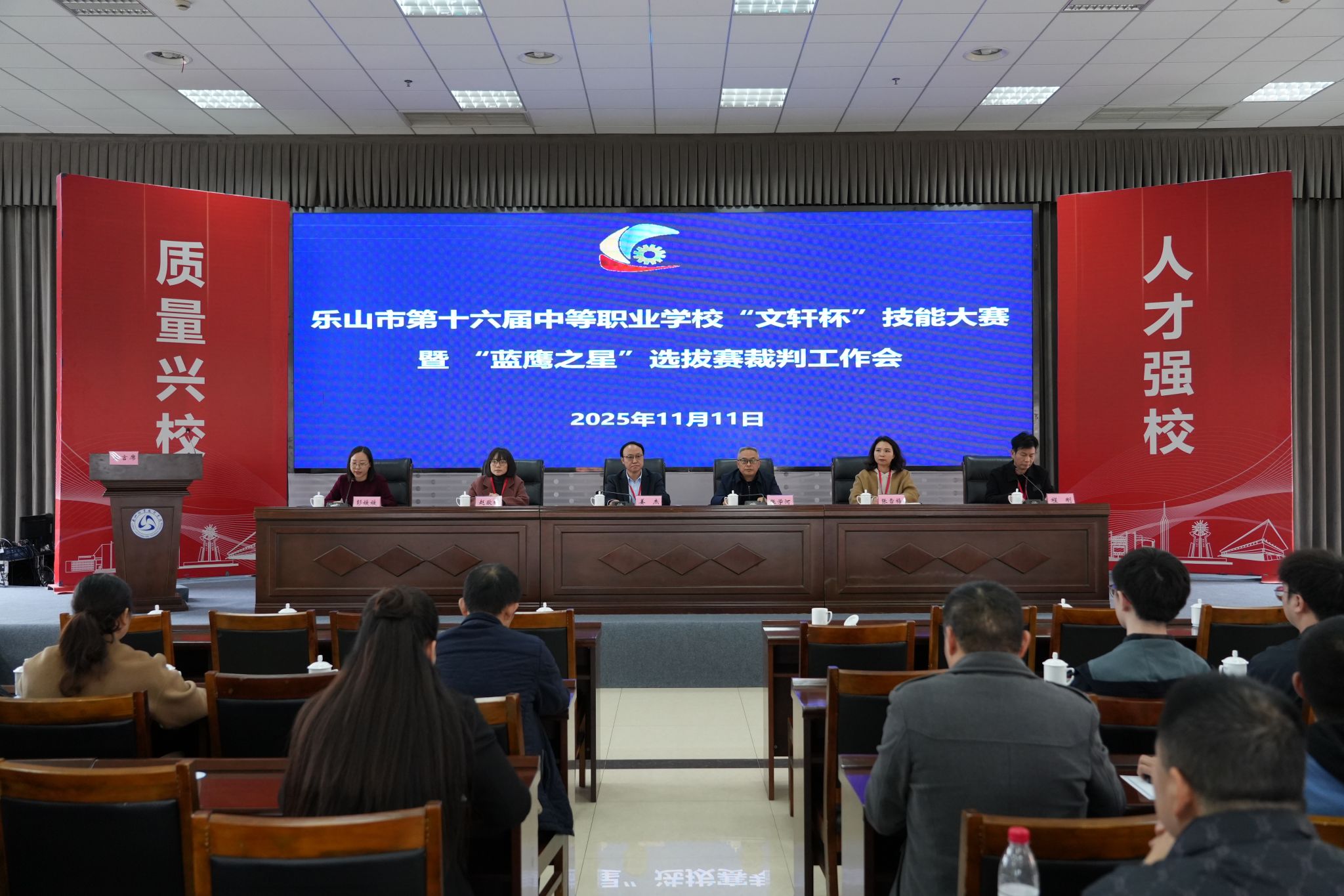2025年11月11日,乐山市第十六届中等职业学校“文轩杯”技能大赛暨“蓝鹰之星”选拔赛裁判工作会议在乐山职业技术学院隆重举行。乐山市教育局四级调研员、市教育系统侨联主席姜杰,乐山市人力资源与社会保障局职业能力建设科副科长赵欧雅,乐山职业技术学院党委委员、副校长张学河出席会议。参加本次会议的还有组委会工作人员、各赛项裁判、监督组成员。会议由继续教育学院(继续教育处)彭媛媛主持。