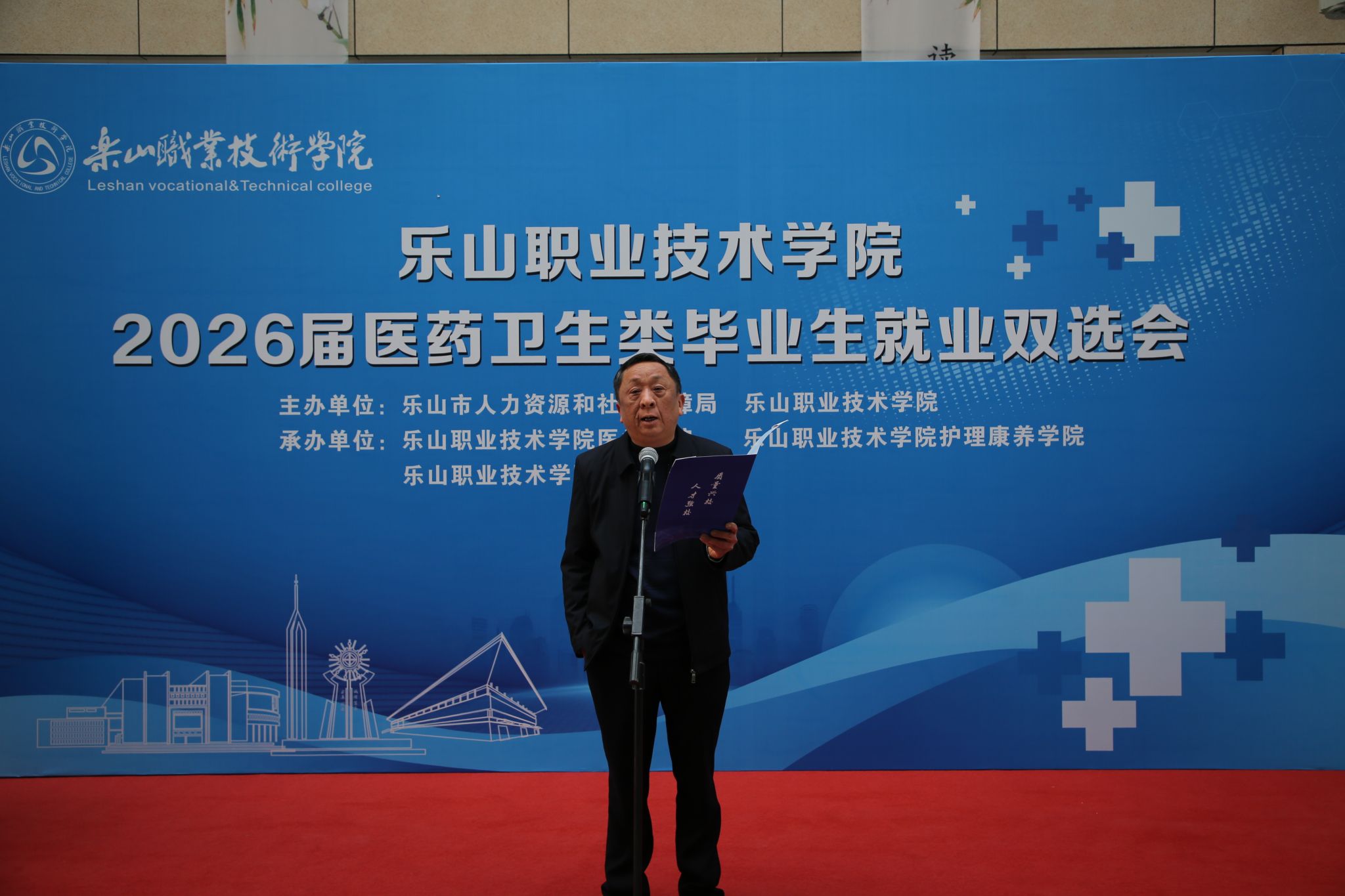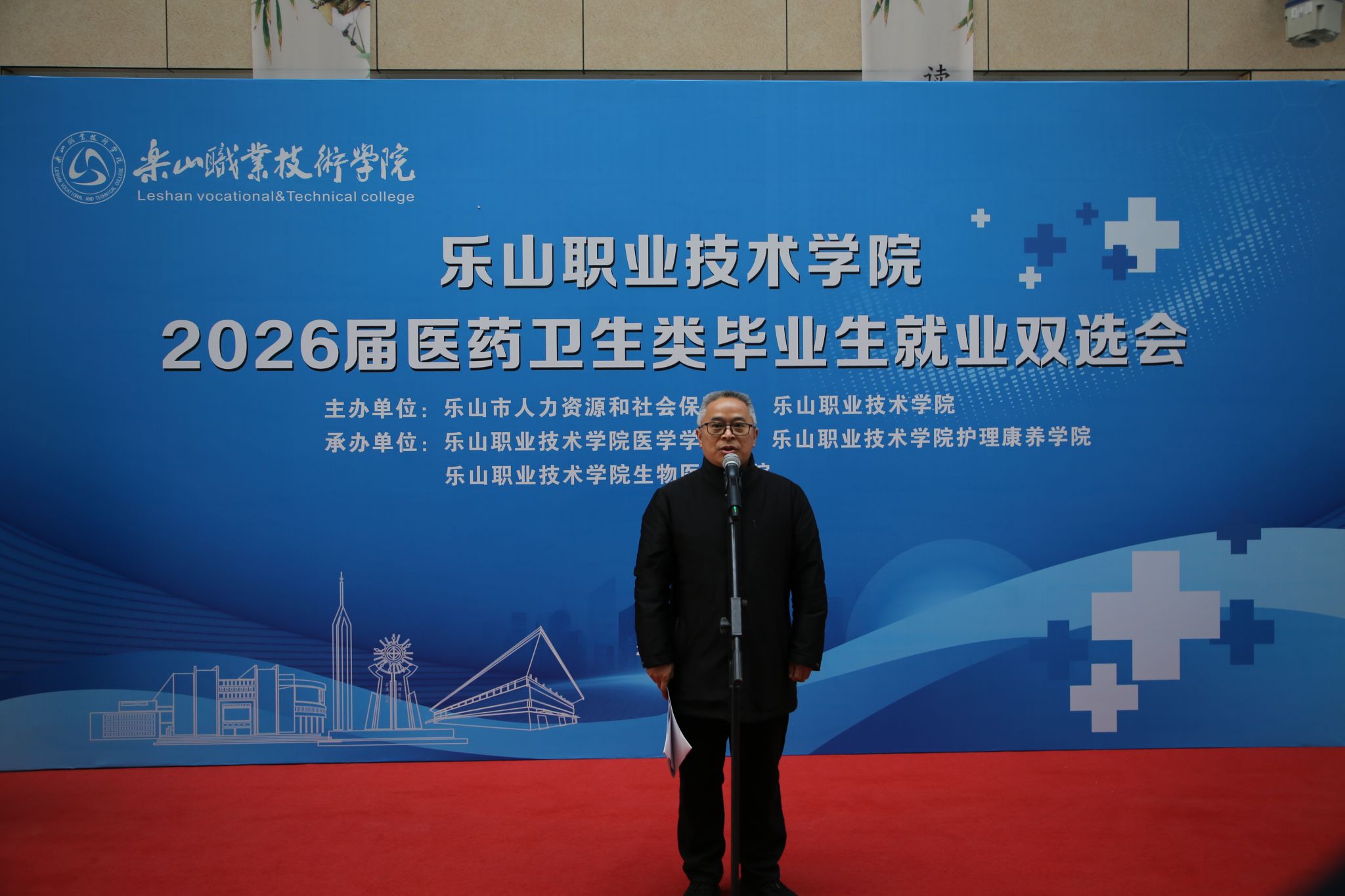 春启新程聚英才,校企携手促就业。2026年1月9日9:00-12:00,乐山职业技术学院2026届医药卫生类毕业生就业双选会顺利举行。乐山市人力资源和社会保障局二级巡视员黄卫东出席活动并致辞,参会企业代表、学院师生代表共同参与。