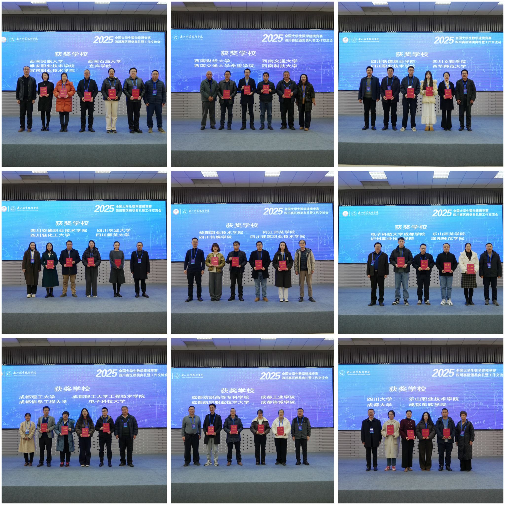 四川学子在2025年的数学建模大赛中再创新佳绩,在颁奖典礼上,四川大学、西南交通大学、电子科技大学、成都理工大学、乐山职业技术学院等在内的数十所高校代表依次登台领奖。颁奖嘉宾阵容强大,涵盖省内多所高校数学学科带头人和教育管理者,体现了全省高等教育界对数学建模育人价值的高度认同。