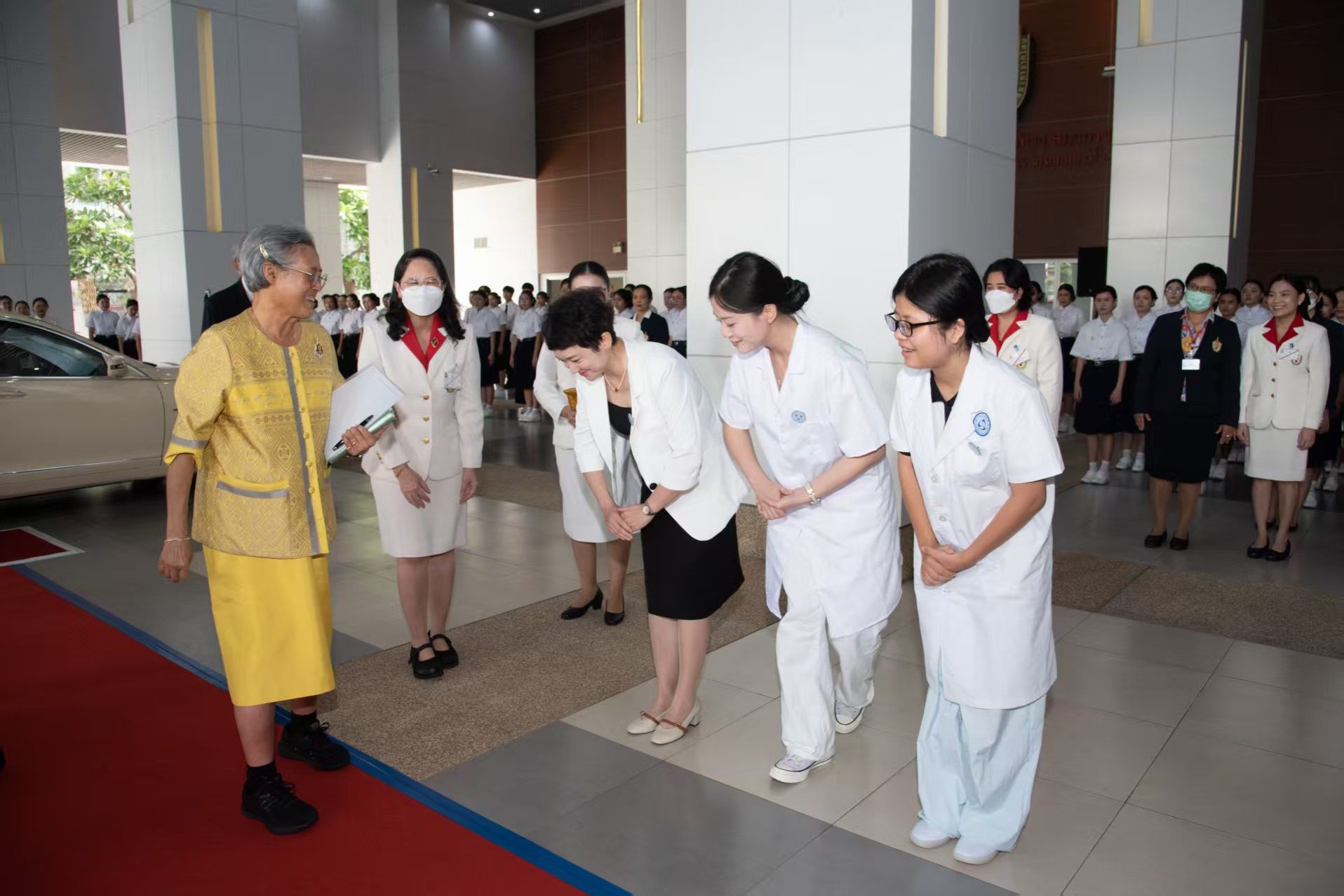 次日清晨,恰逢泰国红十字护理学院新学期开学典礼,代表团获至高殊荣——泰国诗琳通公主殿下亲自接见。诗琳通公主对远道而来的中方师生致以热烈欢迎,充分彰显对中泰教育交流的高度重视。此次交流期间,彭麒燕老师将带领交换生开展多元活动,涵盖实训室观摩、文化互动、医院临床实践等领域。彭麒燕老师两周后返程,两位交换生将继续完成为期两个月的交换学习。