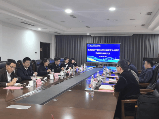 10月29日,广安职业技术学院党委副书记、校长王义全一行4人来校调研交流。学校校长刘忠、党委委员王丽,发展规划处、教务处、新能源与材料学院、智能制造学院相关负责人参加会议。