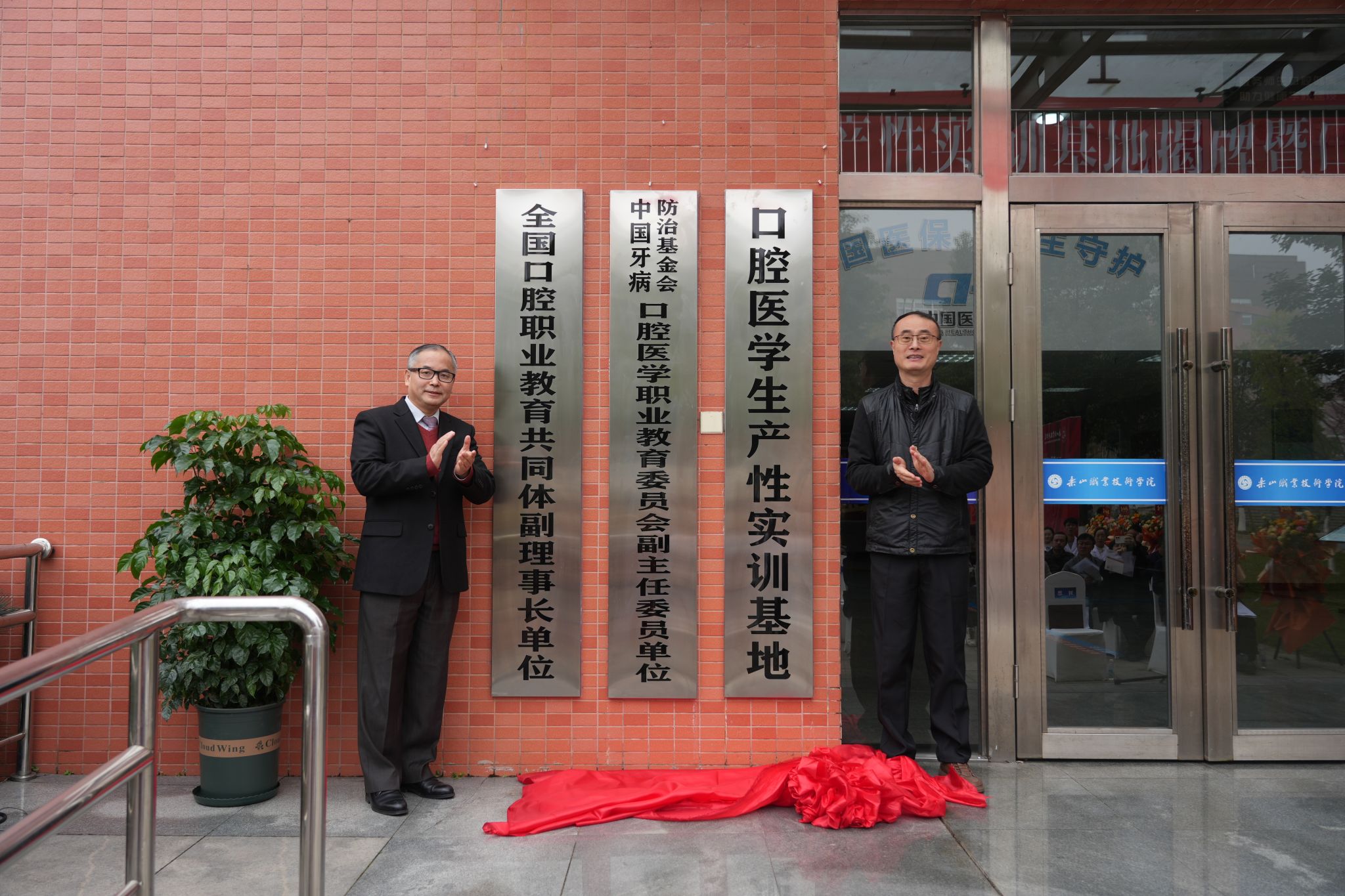 仪式开始,在实训基地一楼大门口举行的揭牌环节中,学校党委副书记、工会主席张佳首先宣读了学校《关于同意口腔医学生产性实训基地运行暨口腔科开业的通知》。随后,学校校长刘忠代为宣读中国牙病防治基金会口腔医学职业教育委员会贺词。贺词中高度肯定了此次实训基地与口腔科建设的意义,称其是高职教育产教融合、医教协同育人模式的创新实践,既传承了精益求精的“工匠精神”,又为基层口腔卫生事业注入新活力。宣读完毕后,校长刘忠与专家代表共同为实训基地揭牌,全体参会人员合影留念。