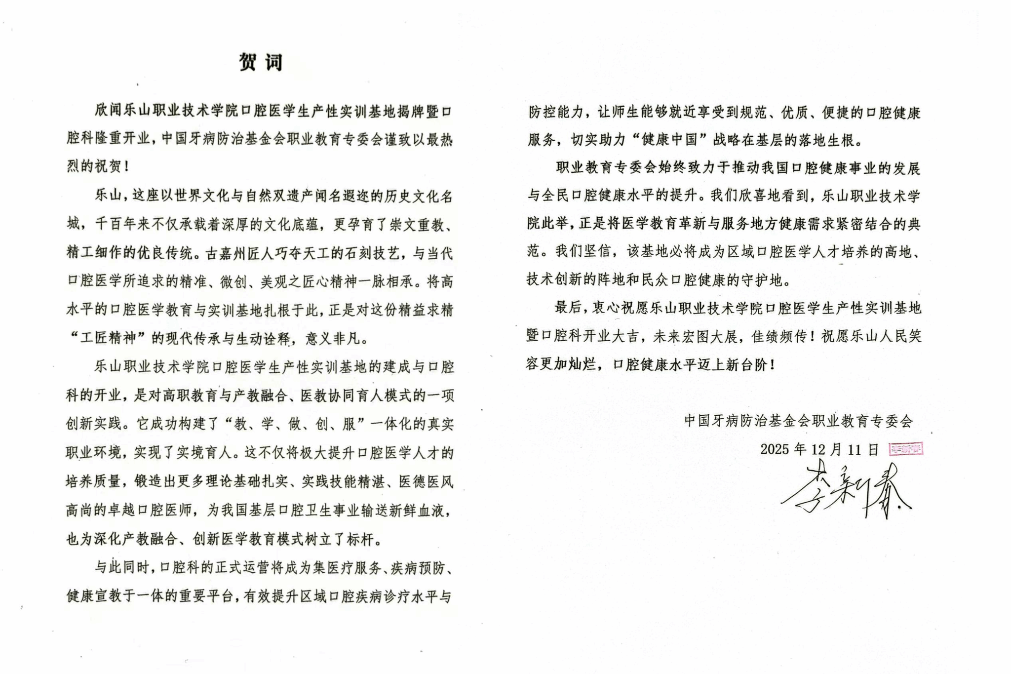 据悉,口腔医学生产性实训基地的建成与口腔科的开业,不仅为乐山职业技术学院口腔医学专业提供了高水平的实训平台,极大提升人才培养质量,也将作为集医疗服务、疾病预防、健康宣教于一体的重要平台,为区域群众提供规范、优质、便捷的口腔健康服务,助力“健康中国”战略在基层落地生根。