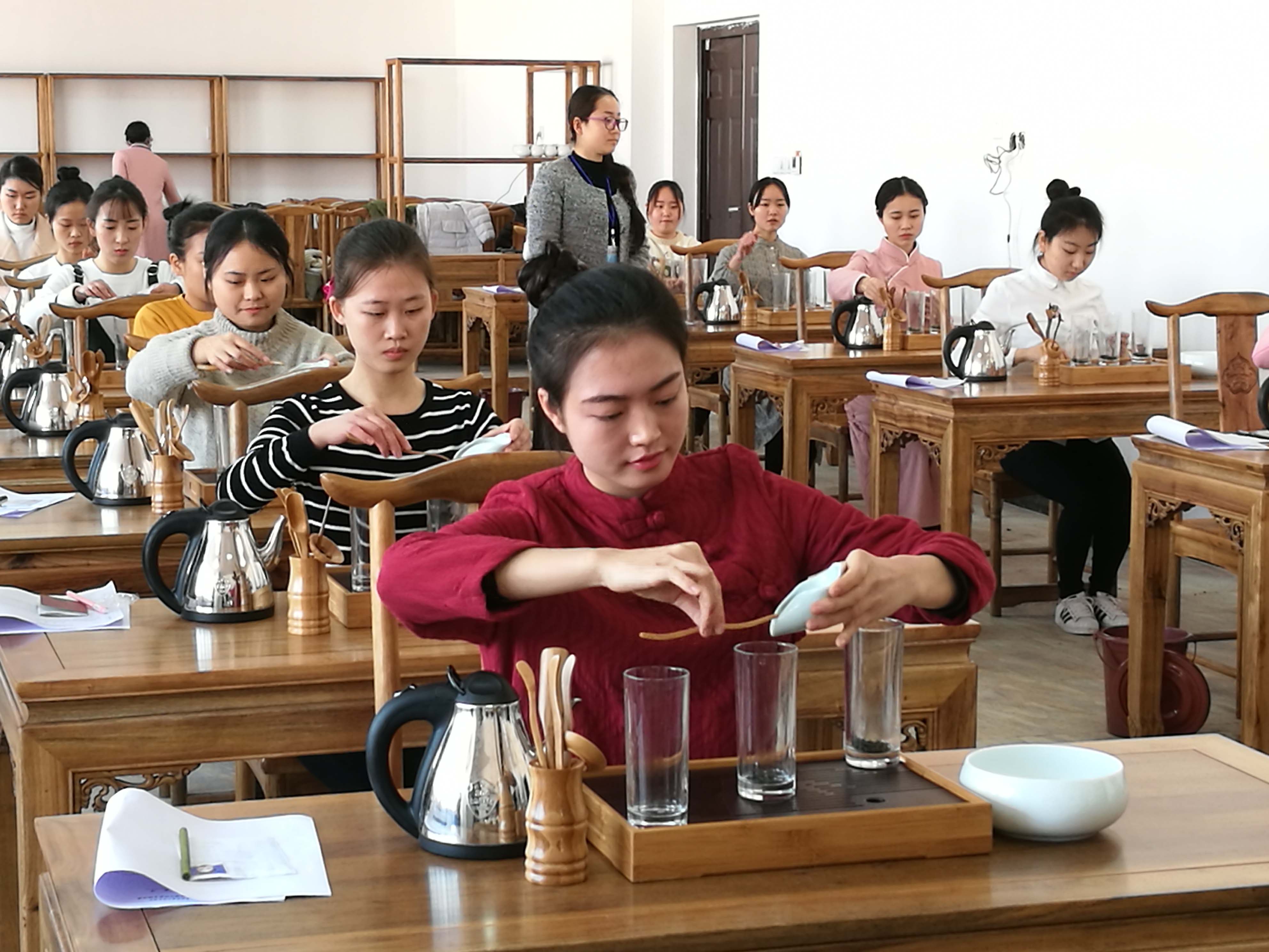 考评员由周晓红、周雅美、胡龙丹老师担任,学员们认真仔细地考理论,实操时一丝不苟的冲泡绿茶,老师们更是尽职尽责,考场严肃有序、忙而不乱,通过长达五个小时的时间结束了本次考试。 考试结束后,记者对彭大婷等同学做了采访,同学们对着镜头表达了对各级领导及老师们的感谢,都说通过此次培训得到了很大的提升,并且深深的喜欢上了我国的茶艺。