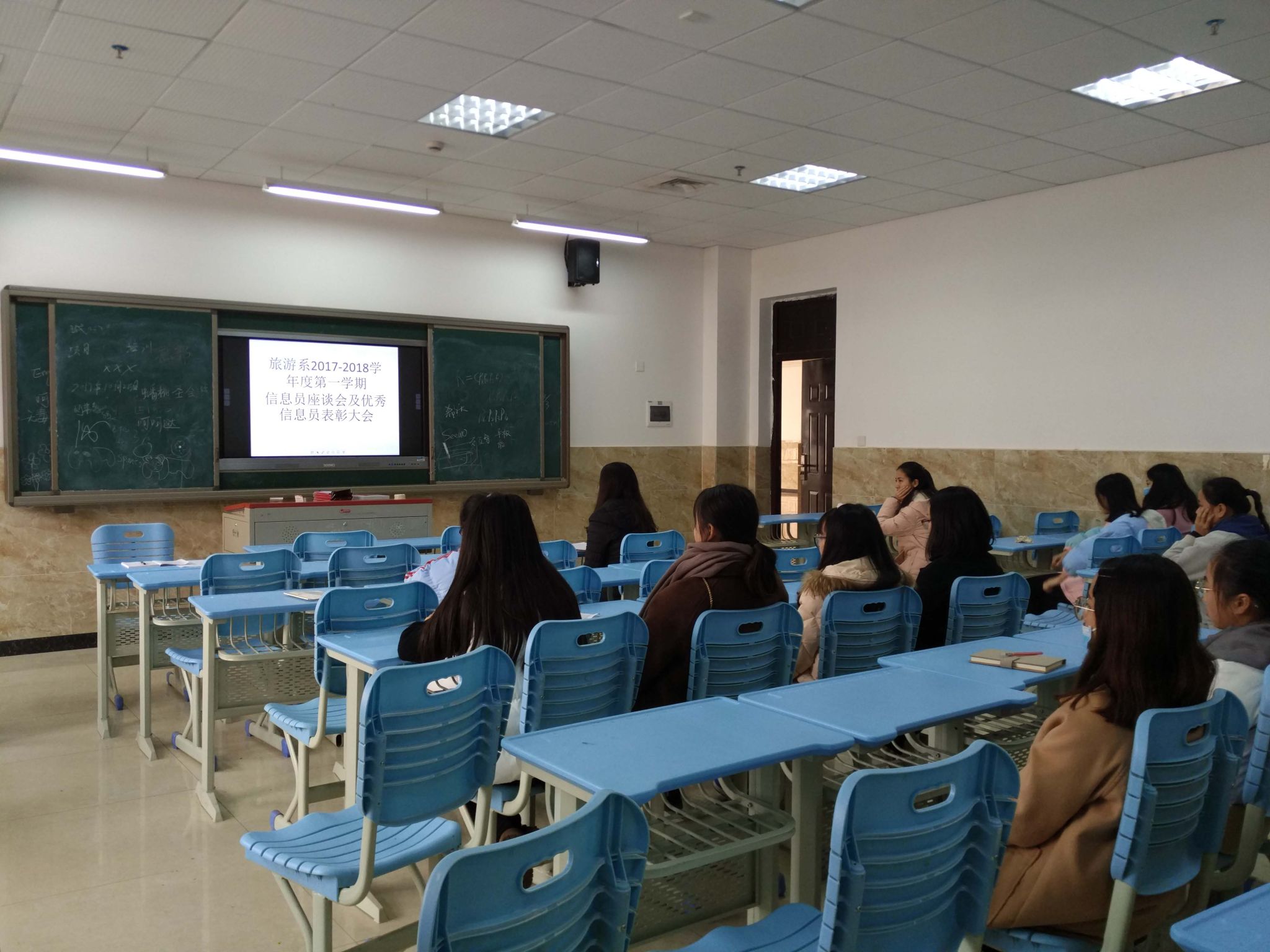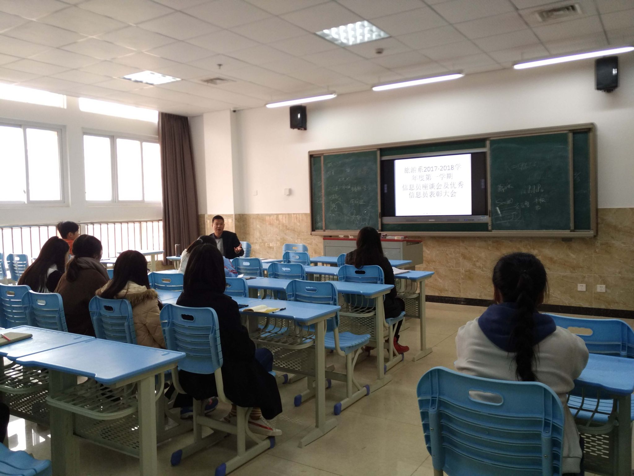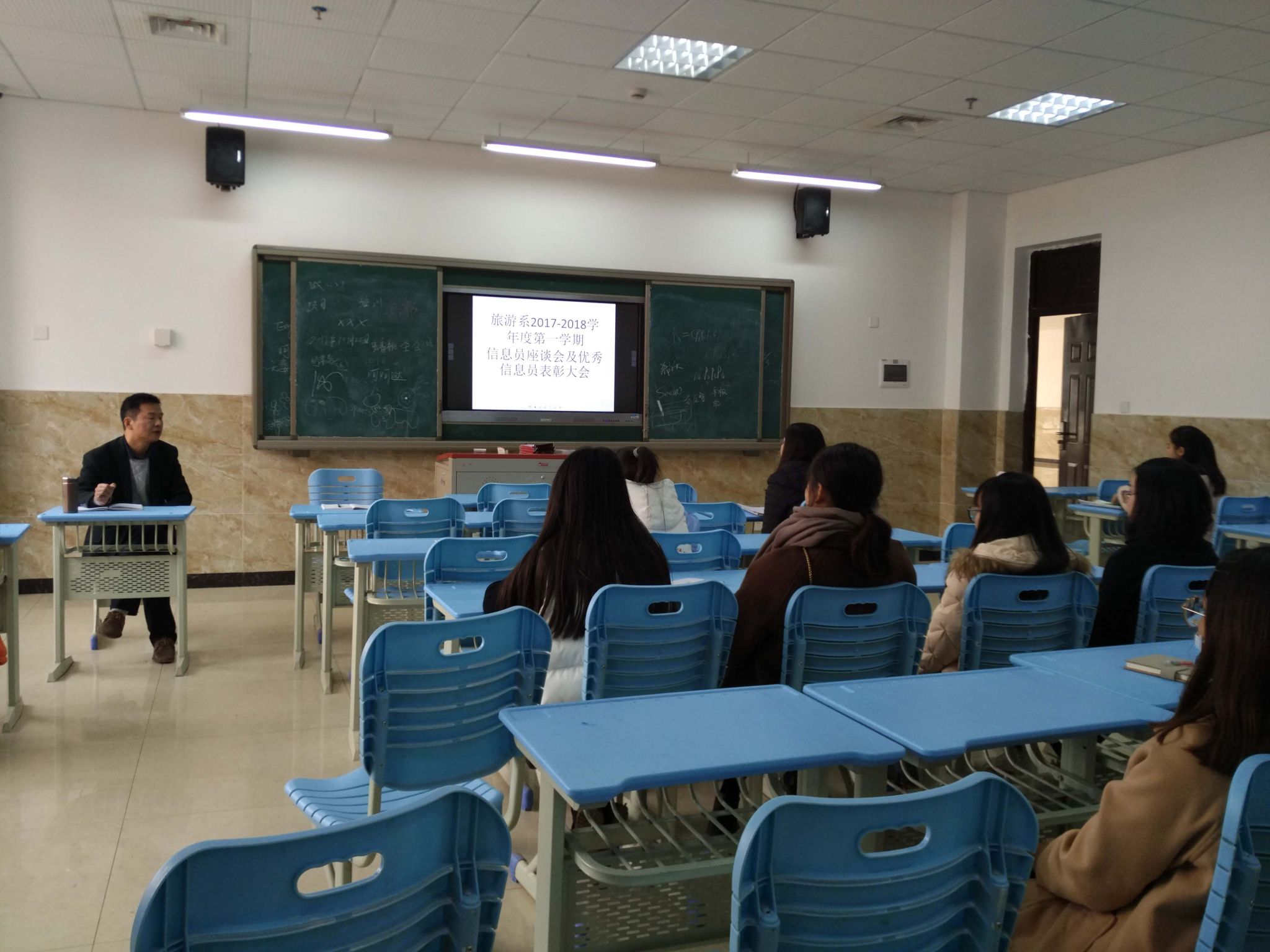 为了解本期学生的学习情况,听取学生对各班科任老师的教学反映及其他情况,2017年12月25日中午12时40分,旅游系在教学楼1A211教室组织召开了由各班信息员参加的座谈会,系教学副主任何加健、教务管理工作人员刘永生参加了会议。
