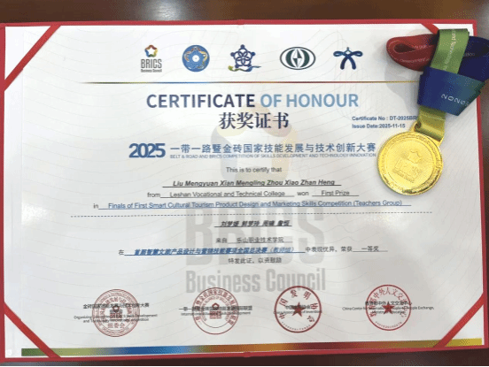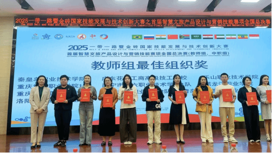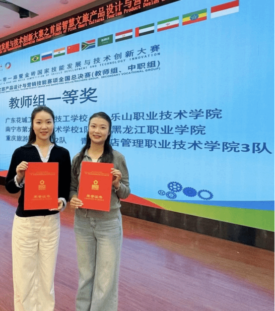 11月15日,2025年“一带一路暨金砖国家技能发展与技术创新大赛之首届智慧文旅产品设计与营销技能大赛”全国总决赛在南宁市第六职业技术学院落下帷幕,我校文化旅游学院选派的教师代表队(参赛教师刘梦媛、鲜梦玲、周啸、詹恒)从全国百余支参赛队伍中脱颖而出,荣获全国教师组一等奖,学校荣获“最佳组织奖”。
