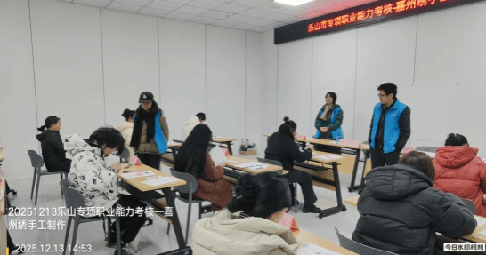 文化旅游学院詹恒、范鸿雁二位教师应乐山市德艺职业技术培训学校邀请,于2025年12月13日下午参与“专项职业能力考核——嘉州绣手工制作”的考评鉴定。此次考评共计23人参加。