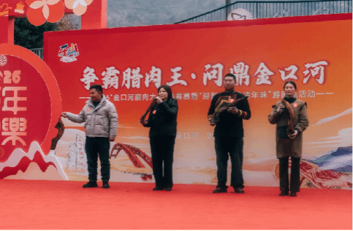 2026年1月30日,文化旅游学院胡文才老师和刘海老师担任金口河区工人俱乐部广场举办“腊肉大王”争霸赛裁判,金口河永胜腊肉大赛分四大比赛项目:头首派、五花派、后殿派、足尖派,40名选手参加腊肉大王争霸比赛,经过烹饪专业评委从色、香、味、形、非遗工艺等方面现场评分,评出四位腊肉大王,对乐山美食之一的金口河腊肉起到进一步的宣传。