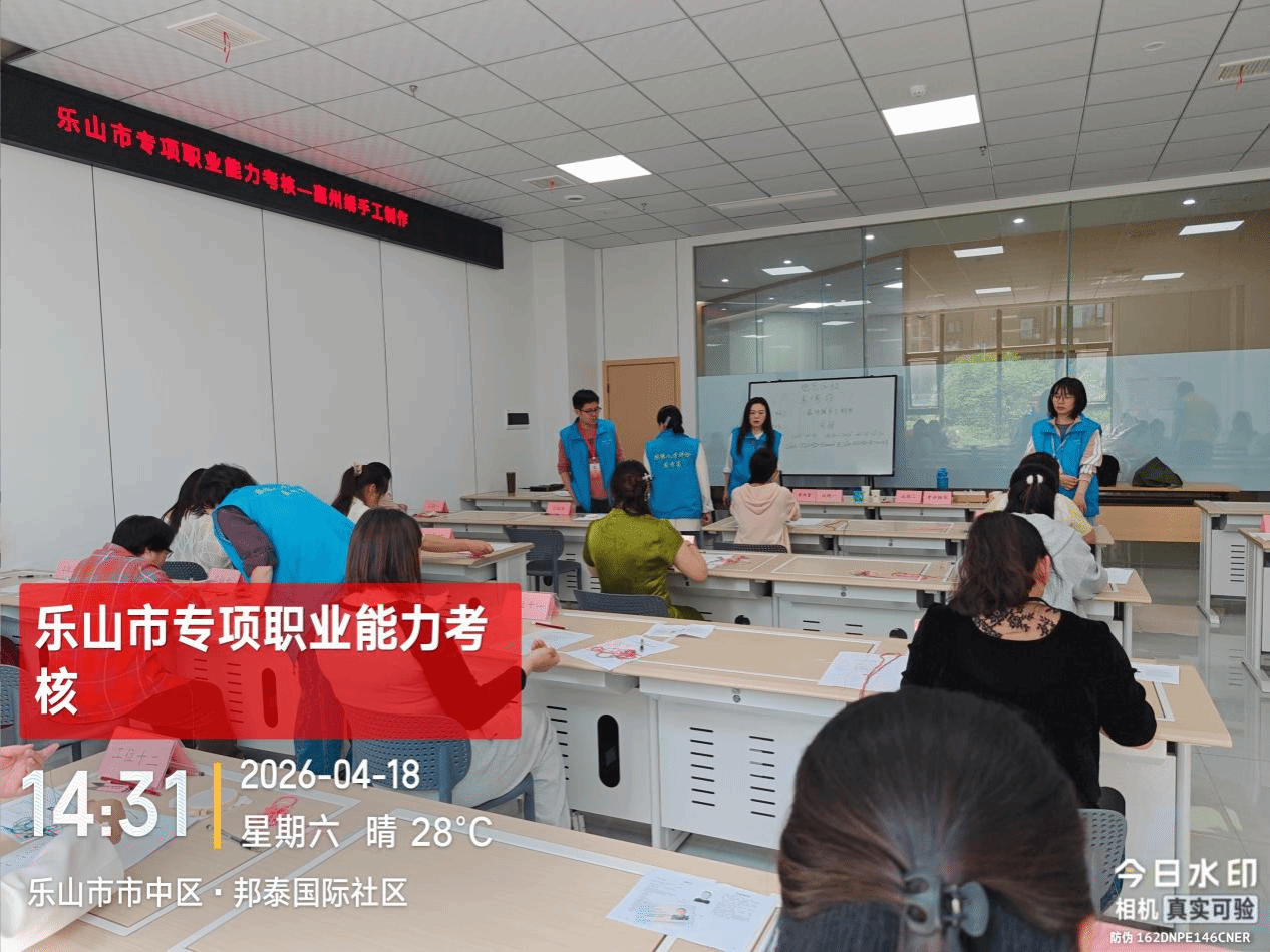 文化旅游学院黎芳、詹恒、范鸿雁三位教师应乐山市德艺职业技术培训学校邀请,于2026年4月18日下午参与“专项职业能力考核——嘉州绣手工制作”的考评鉴定。此次考评共计21人参加。