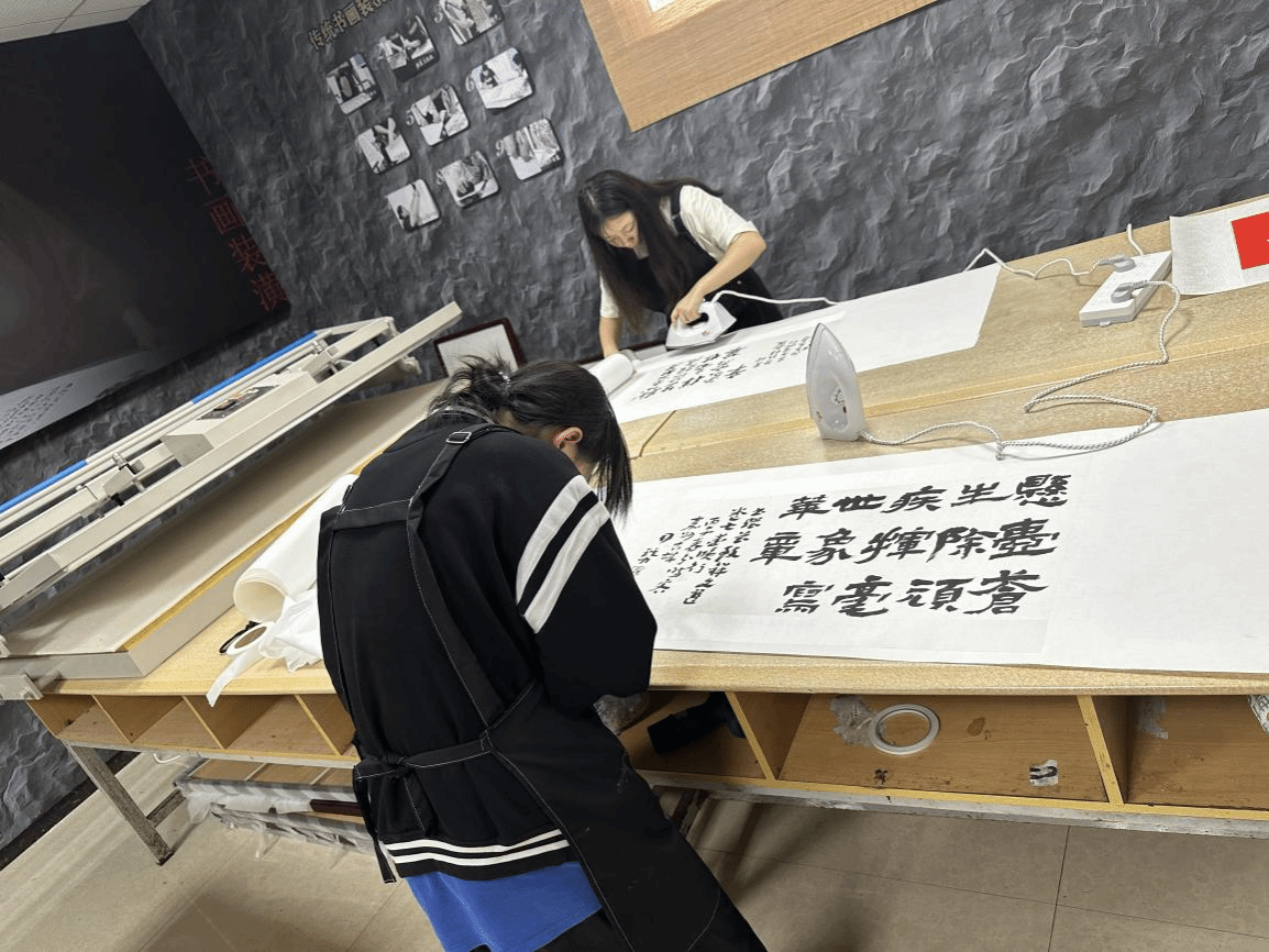 这场师生共修的装裱教学活动,不仅让学生们掌握了书法装裱技巧,更搭建了传统技艺传承的桥梁。通过老师的言传身教与学生的实践学习,让更多书法作品得以被妥善装裱、长久保存,也让装裱这门古老技艺在青年一代中焕发新生。