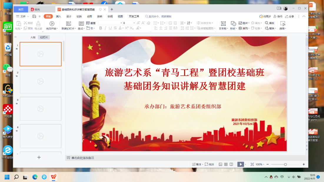 为提升各团支部工作效率,有效利用“智慧团建”系统促进基层团组织的团建工作更具科学化、规范化、网络化,4月11日,旅游艺术系团委组织部在线上平台开展了“基础团务知识讲解及智慧团建操作方法”学习宣讲活动。