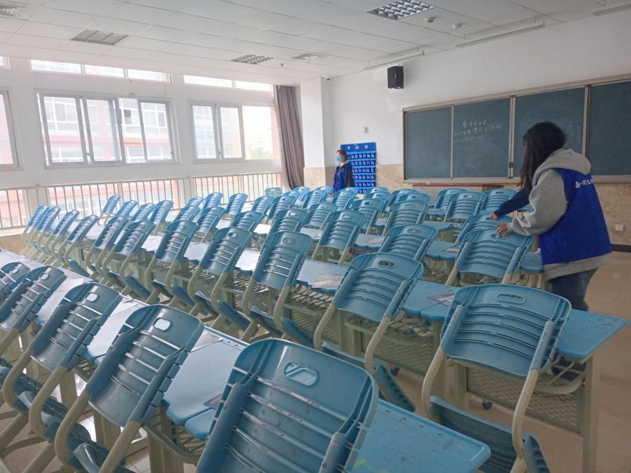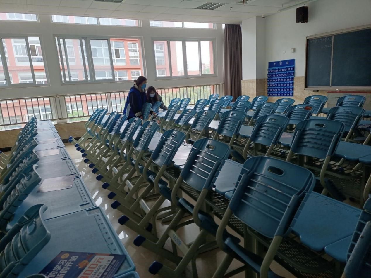 活动过程中,志愿者们按小组分楼层将教室里的桌椅板凳摆放整齐,清理教室遗留的垃圾。参与本次活动的志愿者们不怕苦,不怕累,显示出饱满的热情和积极的态度,通过大家共同努力,1a教学楼所有教室呈现出窗明几净,井然有序的状态。