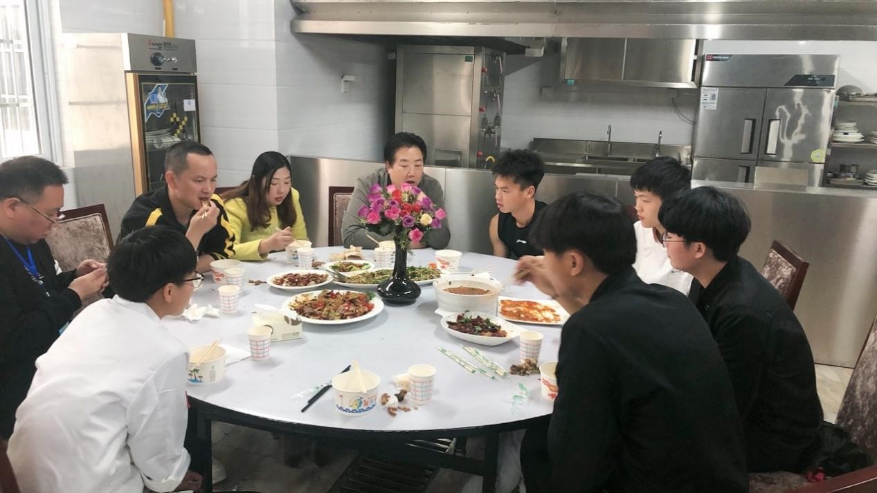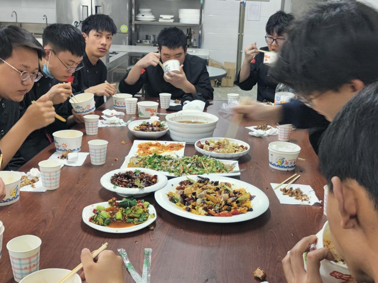 活动当天,班级辅导员张微义和同学们九点半准时来到实训教室。分小组拿到食材后,开始分工合作处理食材。整个烹调实训室忙碌又有序,同学们大展身手,秀出自己的技艺。忙碌了一上午,中午12点整,一道道色香味俱全的菜肴送上了餐桌,大家开始欢声笑语地享受自己烹调的美食,在享受美食的同时,同学们的成就感和专业认同感油然而生。