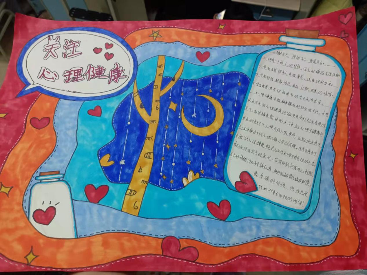 为了让同学们了解心理健康的重要性,和谐同学们的身心健康,了解自己心灵深处的变化,改善和调节学习和生活中的不良情绪,并掌握有效的应对方式,旅游艺术系心理部于2021年12月5日下午14:00在二食堂3楼阳光房开展了心理健康游园会之手抄报活动,本次活动对象为旅游艺术系全体同学。