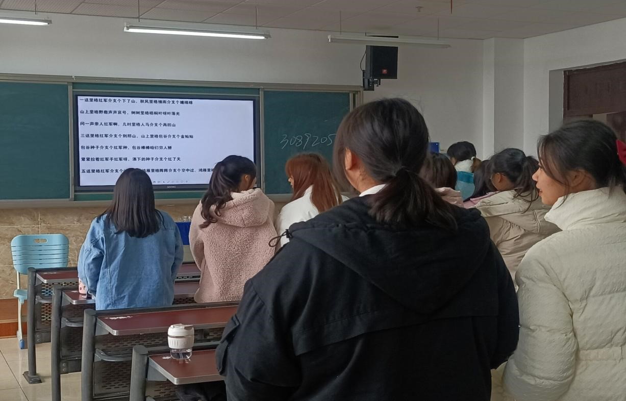 本次活动由导游社王秋兰同学教唱,同学们共同饱含深情地合唱了红色歌曲《十送红军》,歌曲表达革命根据地人民对红军的深厚感情以及对革命胜利的强烈期盼。同学们以响亮的歌声唱响爱国旋律,表达爱国之心。