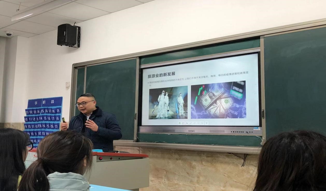 12月22日下午,旅游系副主任王峻峰在2号教研楼2A109教室,为对口联系班级旅游管理专业2021级4班做了题为“旅游业的新发展”主题班会。