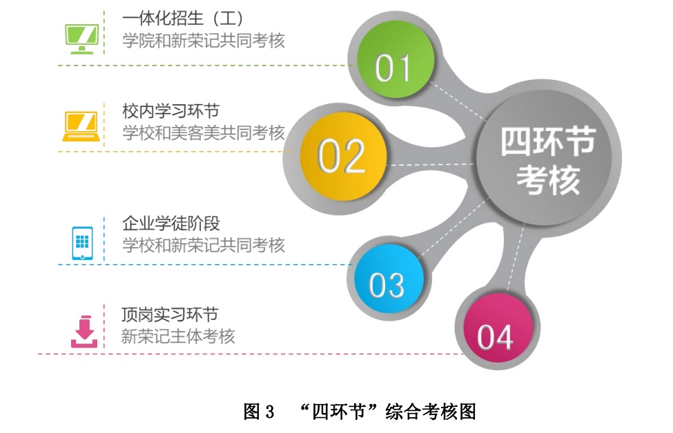 招生(工)录取环节,学院和新荣记共同考核;在校内学习环节,学校和美客美家酒店共同考核;企业学徒环节,学校和新荣记酒店联合考核;顶岗实习环节,新荣记主体考核。每个环节都形成相应的考核指标,根据学生(学徒、员工) 在各环节的表现分别给出评定。其中前两个环节的综合考评结果作为进入新荣记旗下两个品牌(其中“新荣记”为高端品牌、“荣小馆”为大众品牌)学习及实习的基础;各环节综合考核的结果作为学生(员工)培养和晋升的主要依据。