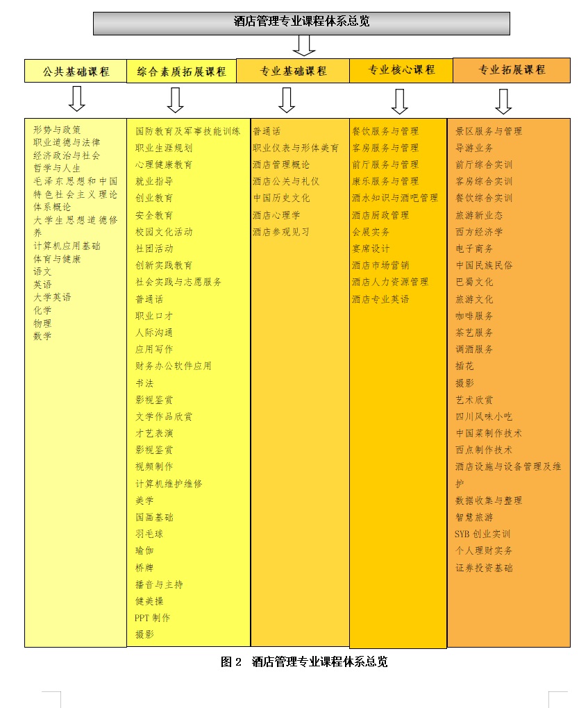 “岗”即岗位;“课”即课程;“证”即职业资格证书。①岗课融合:针对酒店前厅、客房、餐饮等本专业的核心目标岗位群,以打造综合职业能力为目标,参照国家职业标准,通过调研分析,将课程内容与岗位知识、能力和素质对接;②“课证融合”,启动“学历证书+若干职业技能等级证书”(1+X),提高学生的职业能力和就业能力。以岗课证融合思想指导专业核心课程改革,制定课程标准、整合课程资源、构建系统的课程教学体系、实现内涵实用、丰富的教学过程,从而提升人才培养质量,提升办学水平。