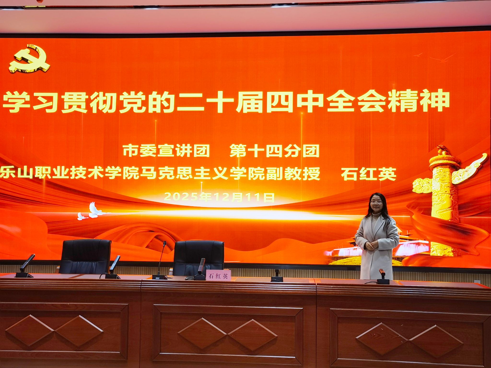 12月11日下午,乐山市第一职业中学在学校学术报告厅举行“学习贯彻党的二十届四中全会精神”专题讲座。市委宣讲团成员、乐山职业技术学院马克思主义学院石红英副教授应邀为学校近200名师生代表作专题辅导报告。