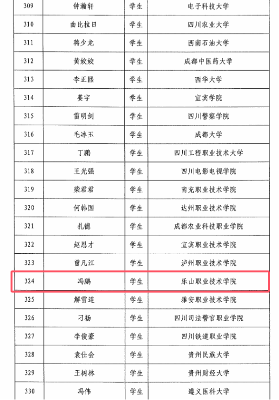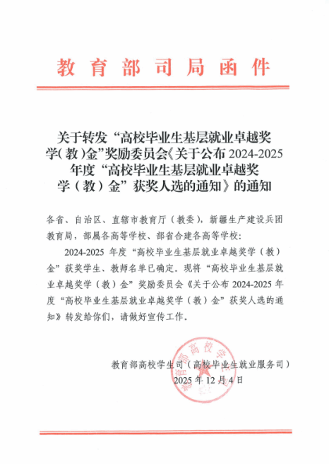 近日,教育部高校学生司发布《关于公布2024-2025年度“高校毕业生基层就业卓越奖学(教)金”获奖人选的通知》,我校现代农业学院农产品加工与质量检测专业2019届毕业生冯鹏获此殊荣。这是我校学子首次荣获该奖项,实现了学校在国家级就业类荣誉上的“零突破”,体现了我校引导毕业生扎根基层、服务国家战略、践行报国使命的显著工作成效。