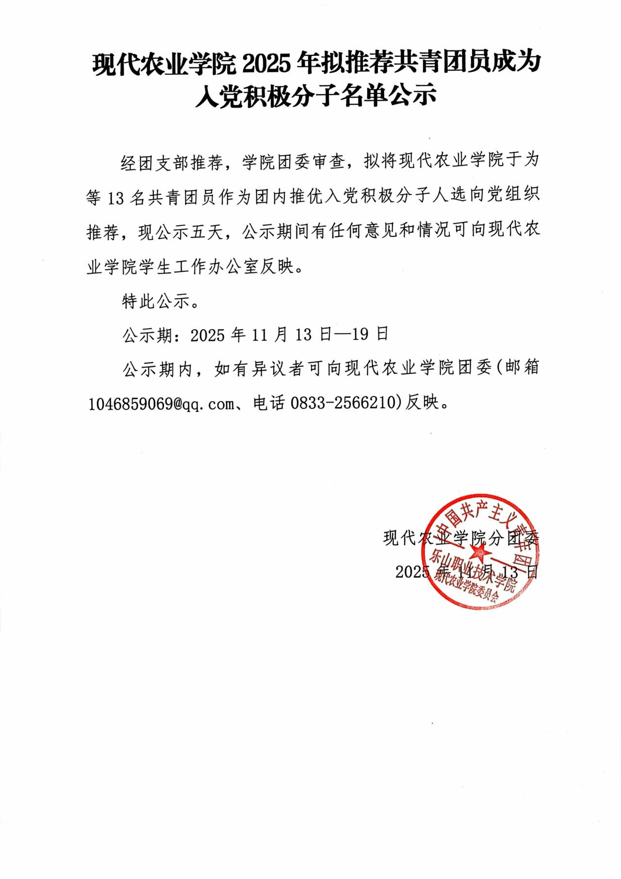 现代农业学院2025年拟推荐共青团员成为入党积极分子名单公示