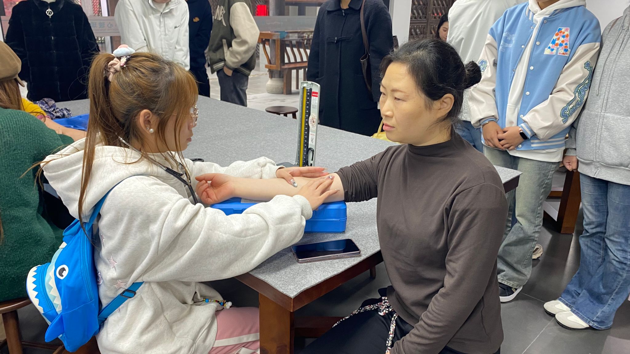 年画体验环节结束后,在白熠皓老师的有序组织下,一场温馨且专业的 “健康义诊” 活动在非遗馆内温情开展。师生们以小组为单位,充分运用所学的护理与康养专业知识,针对非遗传承人们长期伏案创作易引发的健康问题,提供了极具针对性的专业服务,具体包括血压测量、肩颈放松按摩,以及日常健康养护知识咨询等,用实际行动为非遗传承人的健康保驾护航。