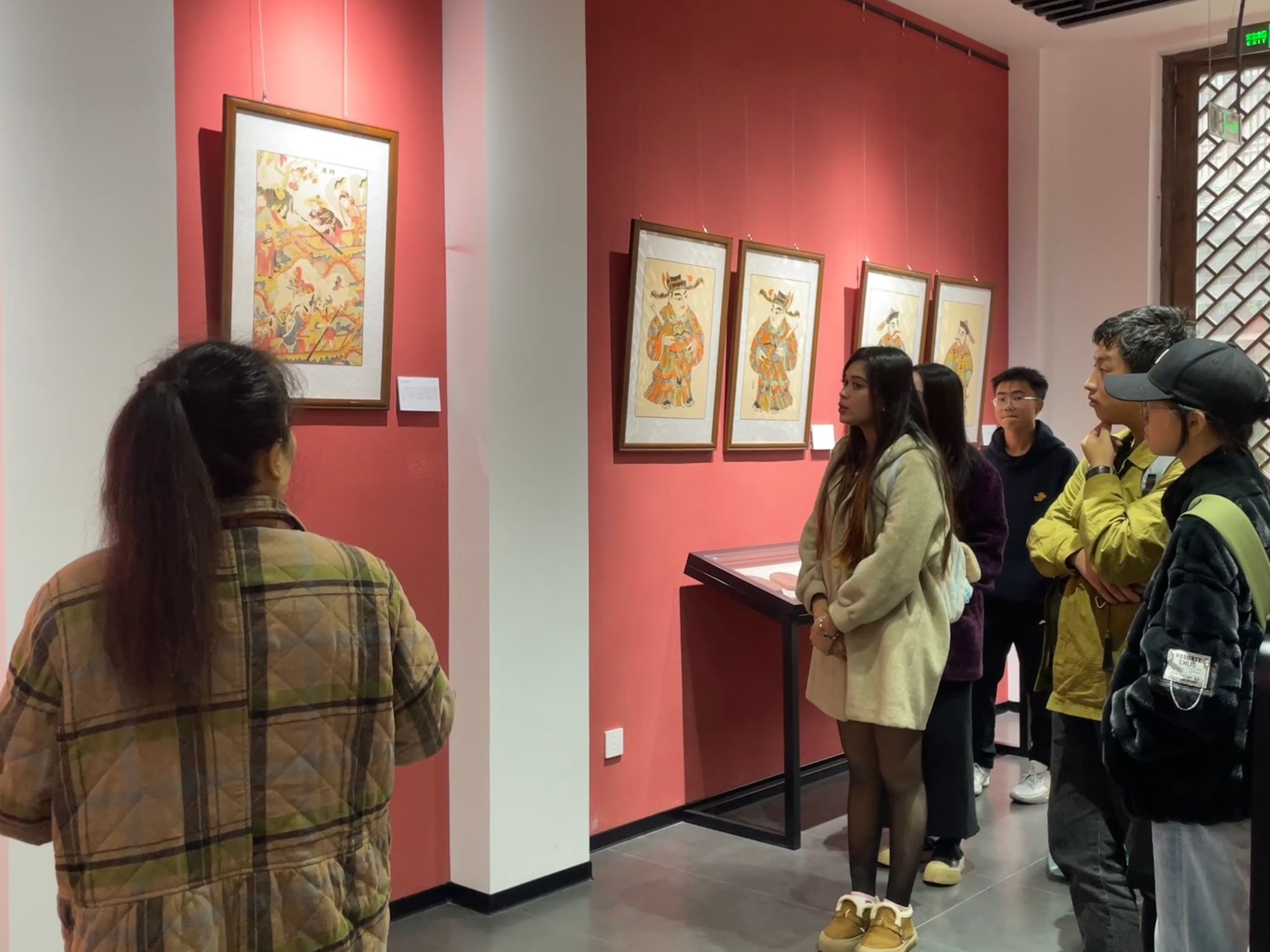 作为国家级非物质文化遗产项目,夹江年画以其浓郁的乡土气息、质朴的艺术风格及独特的制作工艺享誉国内外。活动期间,非遗馆专业讲师带领师生开启了一场沉浸式 “年画文化之旅”,不仅系统讲解了夹江年画数百年的发展脉络、源自植物与矿物的天然颜料制作秘方,更深入解读了各类民间传统年画图像背后蕴含的吉祥寓意与人文精神 —— 从守护平安的门神形象,到传递喜乐的福娃造型,从承载神话传说的经典题材,到反映民间生活的鲜活场景,每一幅年画皆如一扇文化窗口,让中外学子得以直观感知中国人民对美好生活的真挚向往与不懈追求。