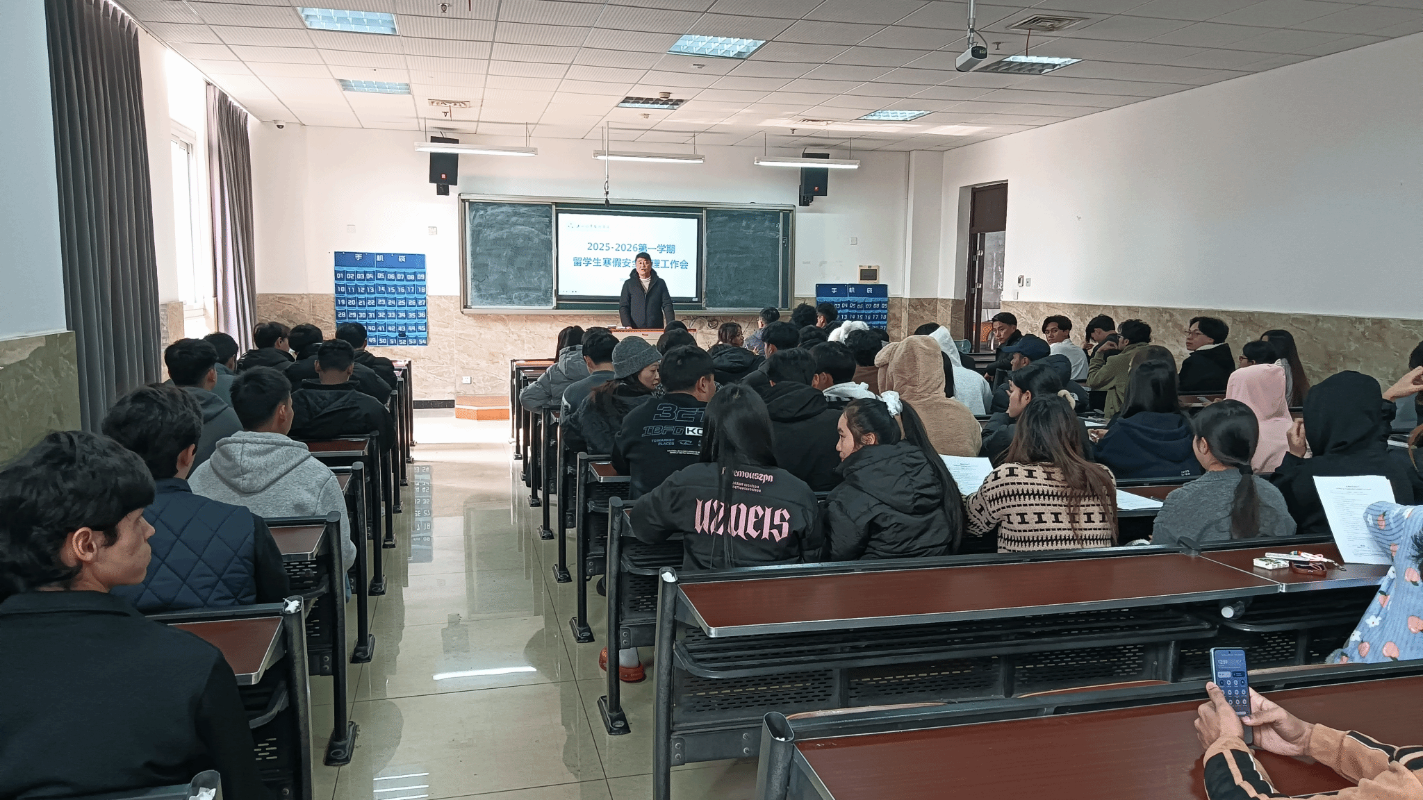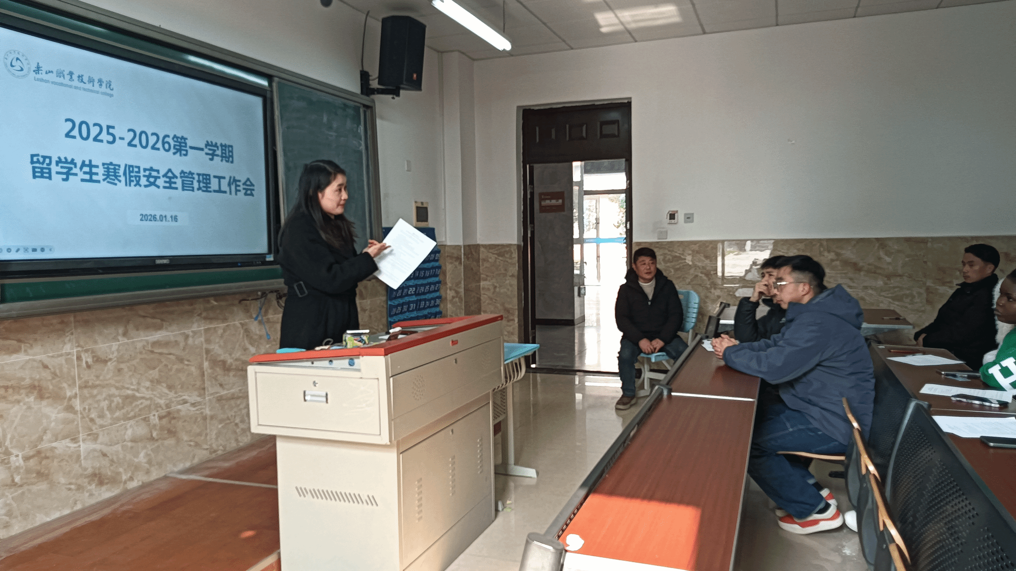 为切实做好留校留学生的安全管理与服务保障工作,确保寒假期间各项管理工作有序推进,有效防范各类安全风险,保障留学生的人身与财产安全,学生工作部于2026年1月16日在教学楼1B104召开了2025-2026第一学期留学生寒假安全管理工作会。