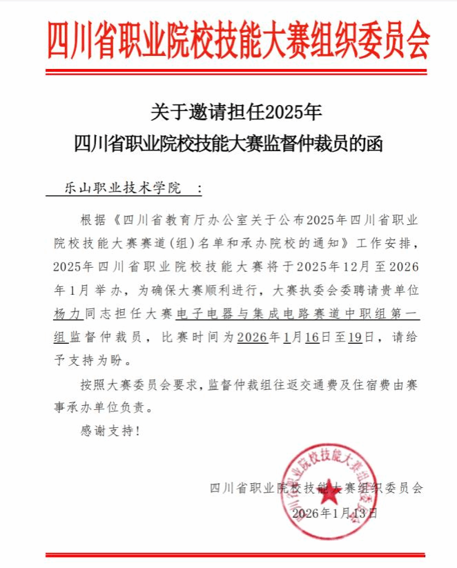 1月16日至19日,2025年四川省职业院校技能大赛“电子电器与集成电路”赛项(中职一组)在宜宾市南溪职业技术学校举行。我校教师杨力受大赛组委会委派,赴宜宾担任该赛项监督仲裁员。