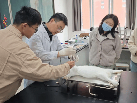 实验过程中,老师们分工协作、有条不紊。从将实验兔平稳固定于兔箱,到精准进行耳缘静脉注射麻醉剂,再到细致分离颈部皮肤与皮下组织、识别并游离颈动脉,每一个操作都彰显着严谨的专业态度。大家围绕实验操作细节、数据解读及可能出现的误差原因展开深入分析。针对部分年轻教师在操作中遇到的疑问,经验丰富的老教师主动示范指导,分享实用操作技巧,营造了互帮互学的良好氛围。