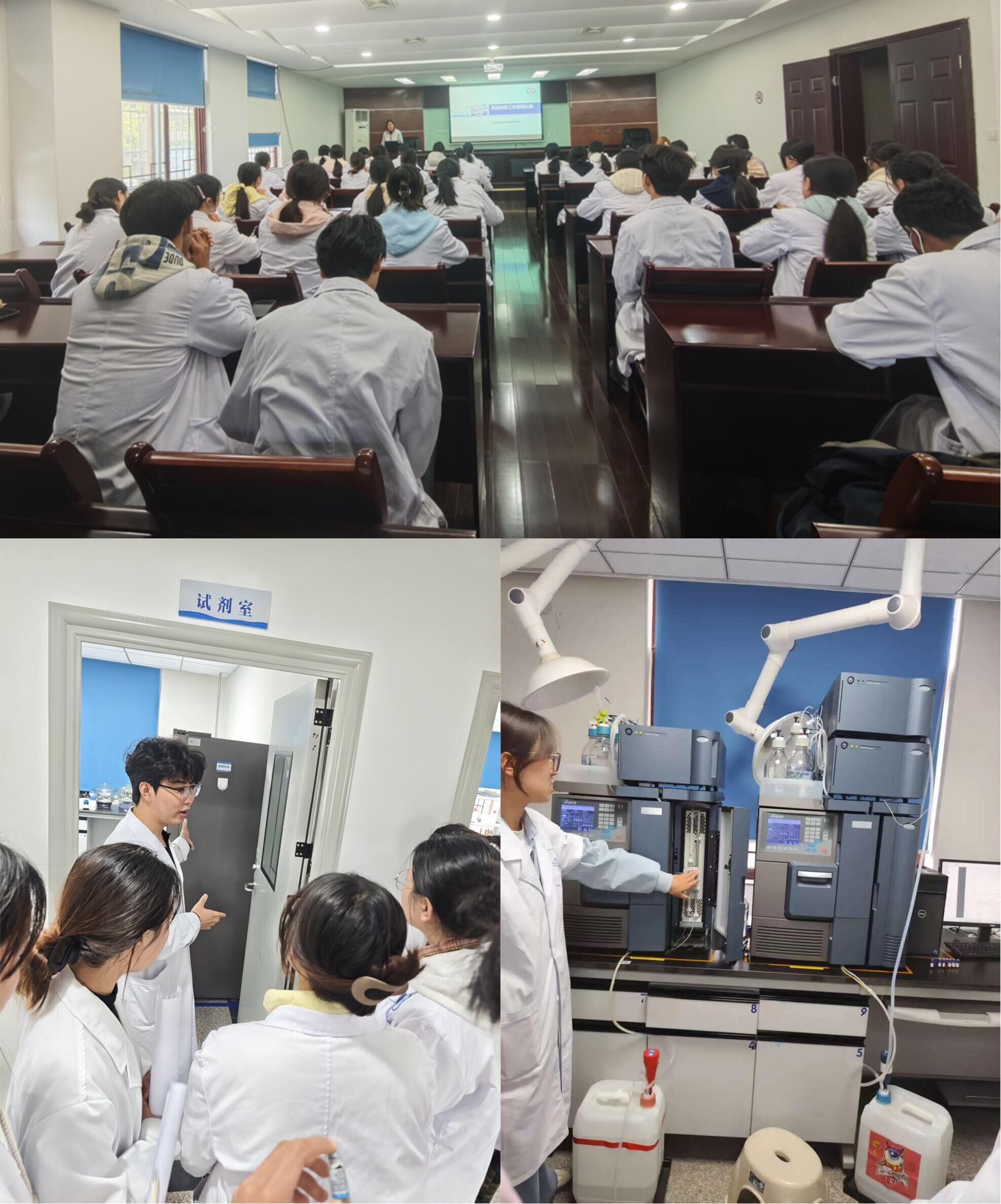 活动得到市食品药品检验检测中心的大力支持。中心副主任药师王丽琼首先为学生们介绍了中心的组织架构、主要职能以及药品检验从样品受理到报告发出的完整流程,并重点讲解了实验室安全注意事项,为接下来的实地参观做好准备。随后的参观环节颇有特色。正在该中心实习的我校23级学生主动担任起讲解任务。结合几个月来的岗位实践经验,这些学长学姐带领学弟学妹们依次走进样品室、称量室、理化分析室、光谱室和液相色谱室。每到一处,实习学生都结合工作实际,讲解该实验室承担的主要检验任务、核心设备的功能和基本操作,以及工作中的注意事项。从高效液相色谱仪到紫外可见分光光度计,这些书本上的名词变成了眼前正在运行的设备,抽象的理论知识与真实的工作场景得以衔接。