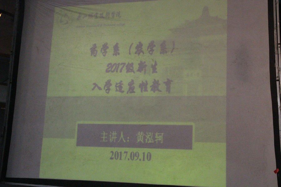 9月10日下午3点,药学系(农学系)在白塔街校区礼堂开展2017级新生入学适应性教育活动,由药学系分管学生副主任黄泓轲主讲。