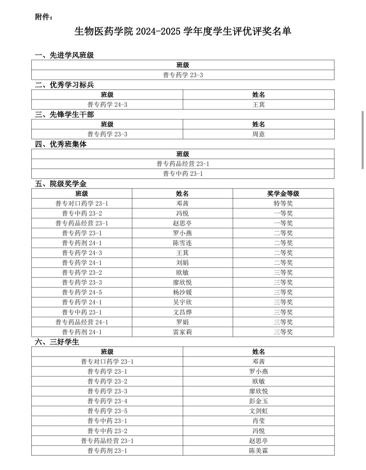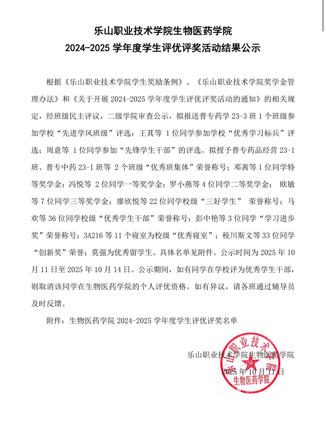 乐山职业技术学院生物医药学院 2024-2025 学年度学生评优评奖活动结果公示