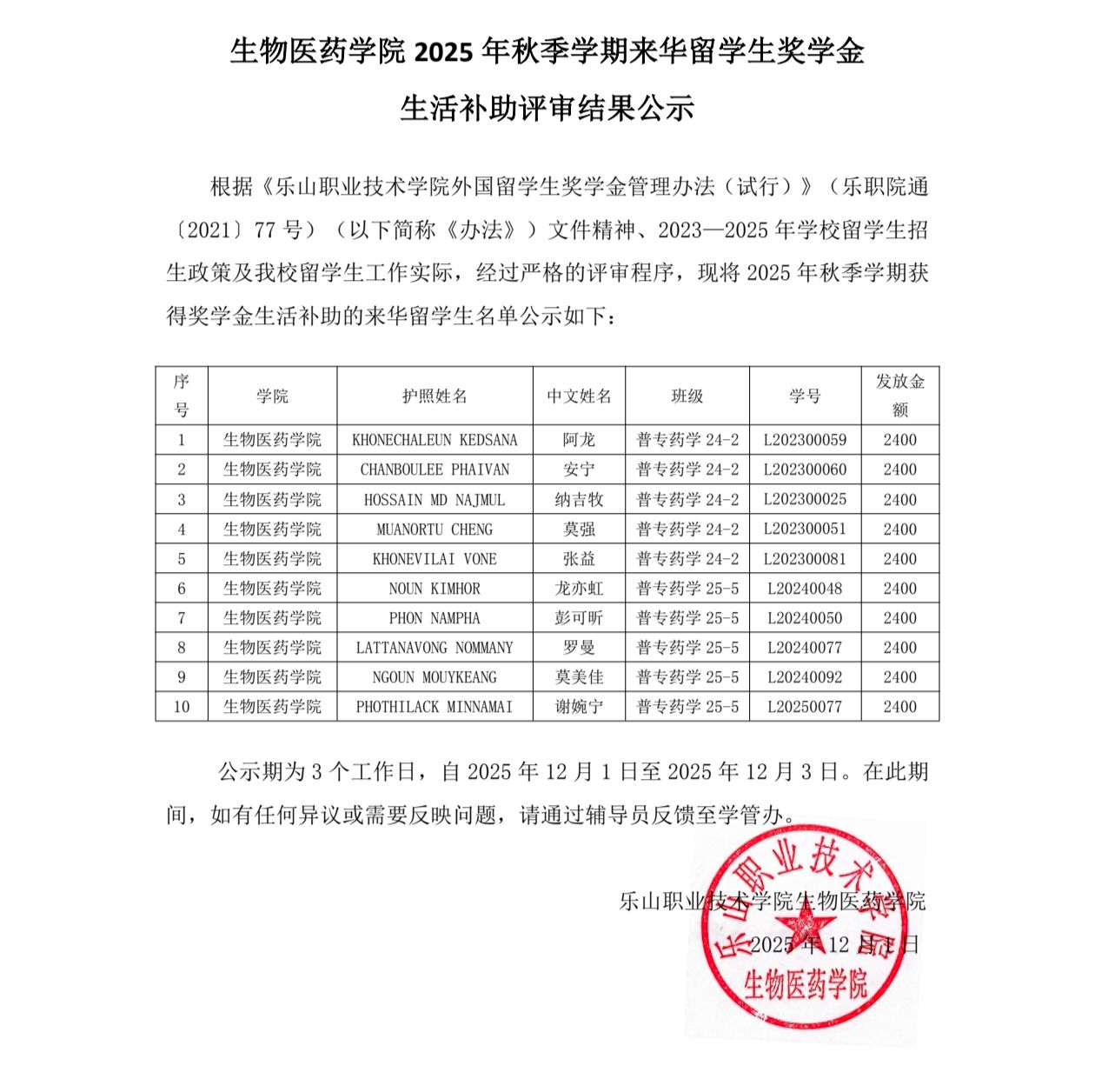 生物医药学院2025年秋季学期来华留学生奖学金生活补助评审结果公示
