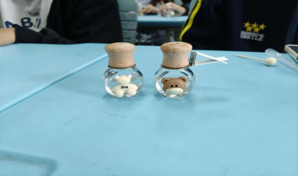 活动筹备阶段,工作人员提前准备好扩香瓶、基础精油、薄荷精油等制作材料。活动正式开始后,首先由指导人员通过图文形式,讲解不同精油的功效及调配比例,重点说明薄荷、生姜精油在缓解晕动不适方面的作用;随后,同学们进入实操环节。他们按照指导人员的步骤,有条不紊地动手操作起来。首先,用量杯小心翼翼地取10毫升基础精油倒入扩香瓶中。接着,用专用滴管分别吸取2滴薄荷精油、2滴生姜精油,依次滴入瓶中,用搅拌棒轻轻搅匀,确保精油充分融合。在这个过程中,同学们相互交流配比心得,分享着自己的发现和感受,现场气氛热烈而融洽。最后,完成制作的同学纷纷上台分享了自己调配的精油用途。有的同学表示,这款精油可以在乘坐交通工具时使用,有效缓解晕车带来的不适。有的同学则认为,它可以放在桌上,在学习疲惫时闻一闻,起到提神醒脑的作用。大家将成品小心翼翼地装入扩香瓶中带走,仿佛带走了一份属于自己的健康与宁静。