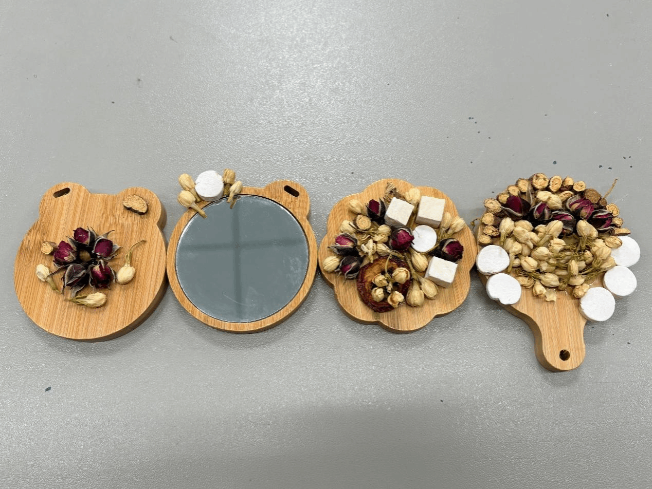 活动伊始,首先由工作人员通过图文形式,详细为现场社员讲解七夕节的传说与“乞巧”习俗由来,深入阐释了中药文化与七夕民俗巧妙融合的思路,介绍制作百草镜所涉及的中药元素以及具体制作步骤,并带领大家一同观看了古代制镜的视频资料:随后,现场演示如何将中药的芬芳与形态融入镜子制作中;演示结束后,社员们兴致勃勃地投入到百草镜子的手工制作中。他们充分发挥自己的想象力和创造力,将中药材与镜子巧妙结合,有的用艾草编织出精美的边框,有的用薄荷点缀出灵动的图案,有的用金银花勾勒出优雅的线条。最后,工作人员组织进行了百草镜子成品展示。社员们纷纷将自己的作品展示出来,每一面镜子都独具特色,散发着中药的芬芳和传统文化的魅力。大家相互欣赏、交流,分享着制作过程中的心得与体会。
