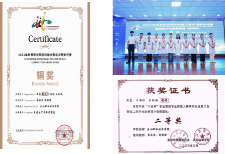 在专业竞技的舞台上,她同样成绩斐然。在指导老师的悉心点拨与专业集训下,她刻苦钻研、精益求精,获得2025年世界职业院校技能大赛总决赛医药生产与经营赛道铜奖、第四届“川渝杯”职业院校学生技能大赛药学技能赛项二等奖。这些赛事的历练,不仅印证了其扎实的专业技能与过硬的心理素质,更体现了学院优质教学与个性化培养的成果,彰显了生物医药学院学子追求卓越、敢于争先的精神风貌。