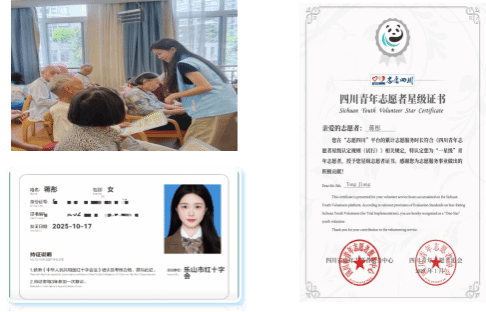 入学之后,她凭借“四川省星级志愿者”的荣誉与“红十字救护员”的专业资质,将药学知识与人文关怀深度融合于养老院志愿服务中。定期为老人测量血压、讲解用药安全,更运用急救技能守护老人健康。这段经历让她深刻体会到药学服务的温度,在实践中淬炼了“奉献、友爱、互助”的志愿精神,彰显了新时代药学青年服务基层、回馈社会的责任担当。