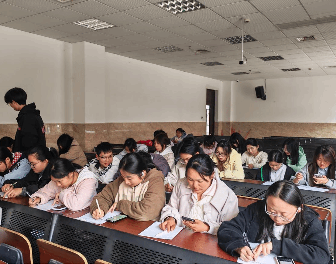 活动伊始,主讲人围绕活动主题进行现场引导,结合春日自然风貌分享感悟与书写思路,屏幕上春意盎然的画面与温柔的讲解相融,让现场氛围愈发温馨。同学们认真聆听,细心地记录下每一个关键要点,在讲解中努力探寻着属于自己的创作灵感。