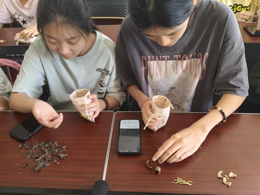 活动伊始,负责人向同学们细致介绍了本次活动所要用到的艾草、薄荷、丁香、桂皮等多味中药材,逐一剖析每味药材的独特形态特征,深入阐释其性味归经,并详尽讲解功效用途。这一环节,既传承了传统香囊“芳香辟秽、通窍醒神”的防疫智慧,又巧妙融入了现代养生中安神助眠的实用需求。随后,负责人将精心准备的香囊包与药材一一分发到同学们手中,同学们迅速分组,彼此默契协作,热烈交流创意。他们以干制药草为天然原料,以香囊为精美载体,在指尖的灵动缝制中,真切感受着传统工艺与自然草木的完美融合。每一个精心制作的香囊,都化身为传播中医药文化的灵动使者,传递着古老而深邃的东方智慧。