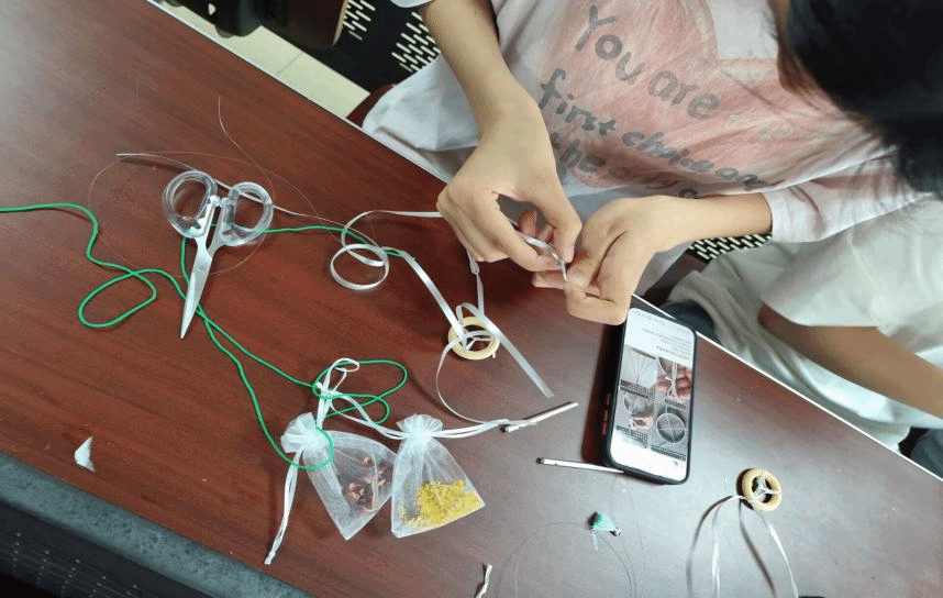 活动伊始,负责人向同学们讲解中医药康养文化的基础知识和药香风铃的制作流程,让大家快速掌握制作技巧。随后进入动手制作环节,工作人员为同学们分发手工制作材料,大家兴致盎然,全身心投入到手作之中。穿针引线、填充药草、系挂风铃、组装配件,氛围温馨又热闹。风铃制作完成后同学们互相交流、大方展示,既锻炼了同学们的动手能力,又能近距离接触传统中医药文化,通过药香舒缓身心压力。